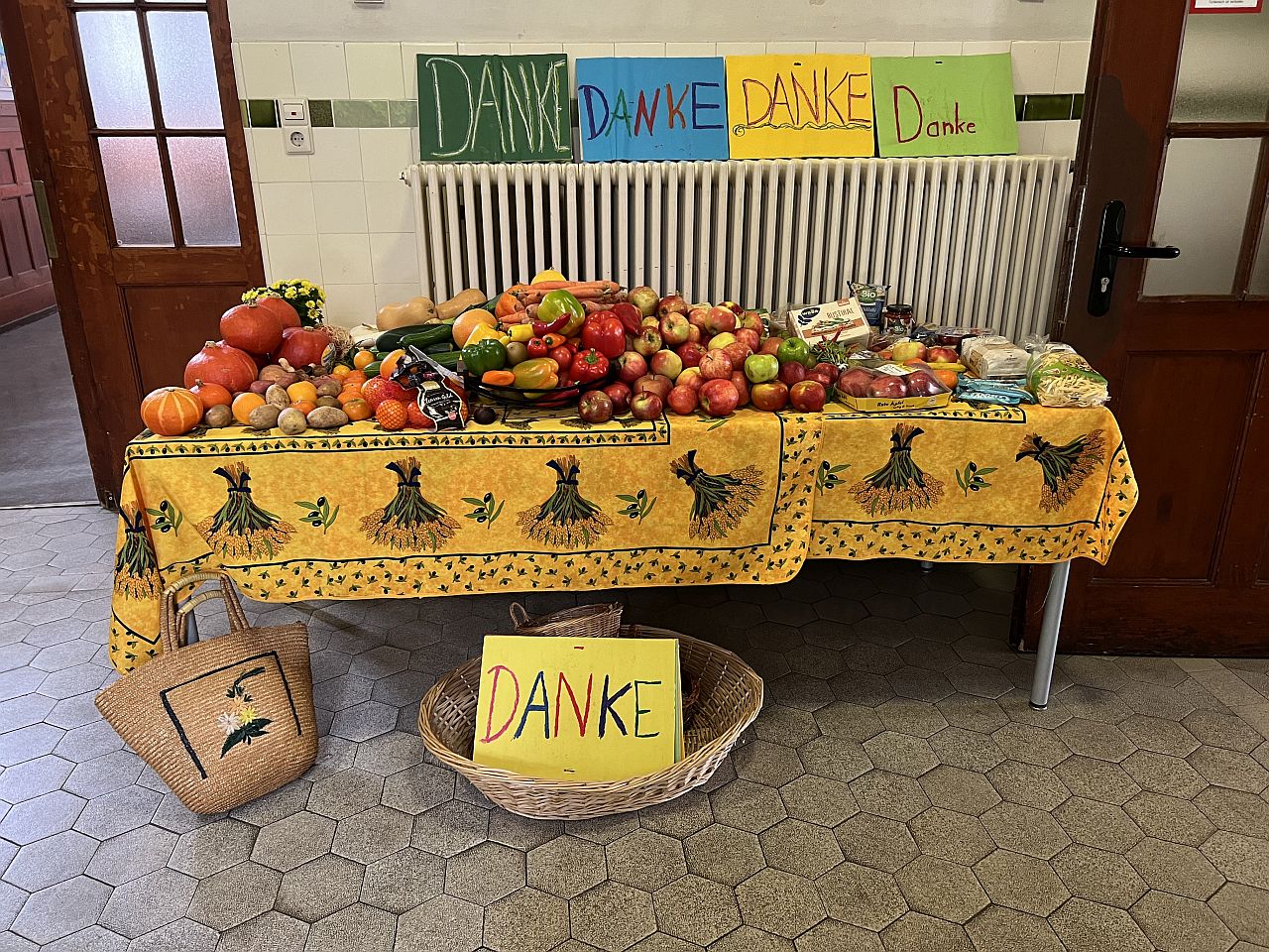 Grund der Feier war das alljährliche Erntedankfest der christlichen Kirchen, das laut Jahreskreis in der Regel am ersten Sonntag im Oktober stattfindet. Das Ritual, das die Kinder am schönsten empfinden, ist das Mitbringen von eigenem Obst oder Gemüse, das auf einem Gabentisch präsentiert wird, um es am Ende der Feiern zur Beiertheimer Tafel zu bringen. Die Freude und der Dank über die reichliche Ernte, die uns zuteilwurde, konnten uns dazu befähigen, selber zu teilen. Ein Stück vom eigenen Besitz an die abzugeben, die nur sehr wenig haben, brachte die Kinder, egal welcher Religionszugehörigkeit, zum Strahlen.
