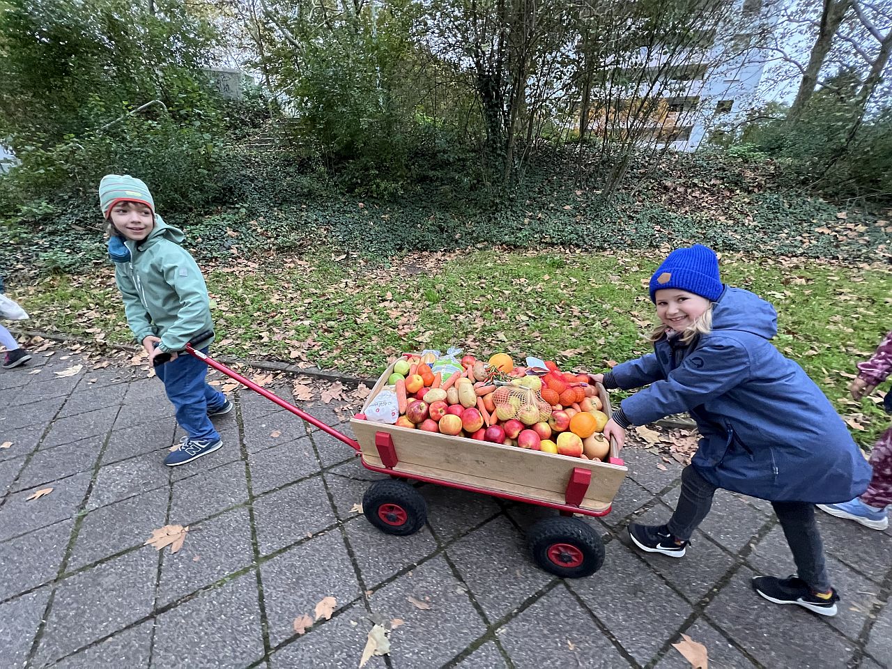 Am nächsten Tag brachte die Klasse 2b die Gaben in vollgepackten Taschen und übervollem Bollerwagen zur Beiertheimer Tafel, wo uns Herr Strobel schon in Empfang nahm. Wie immer durften die Kinder die vielen Spenden selber in die noch leeren Obst- und Gemüsekisten einräumen. Glücklich und fidel ging es zurück zur Südend-Grundschule.