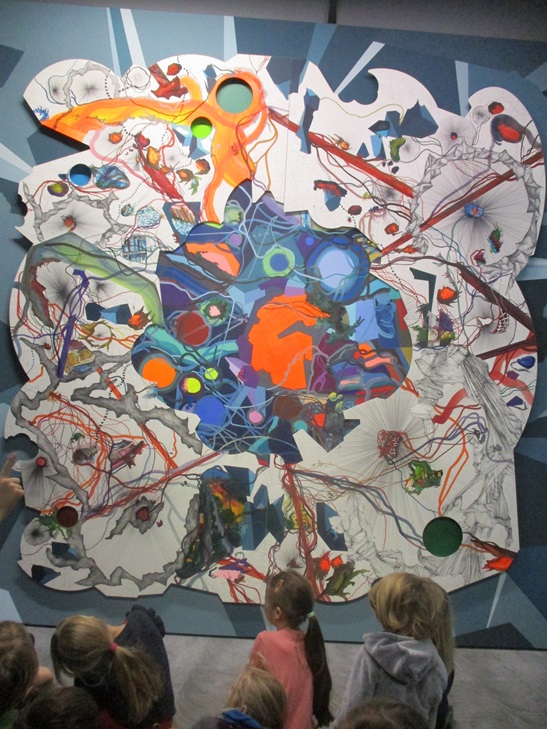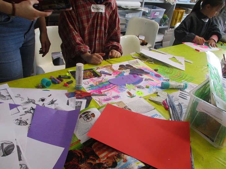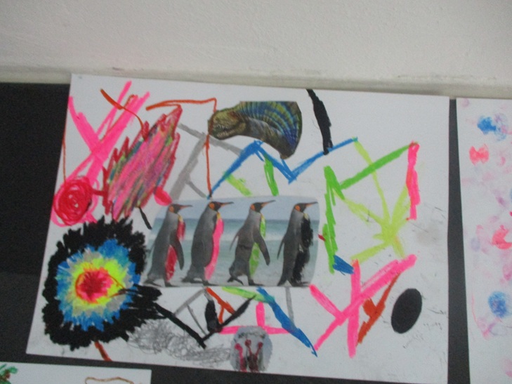 Heute besuchten wir zum zweiten Mal die Städtische Galerie hinter dem ZKM Filmpalast. Pipa, unser Klassenpinguin, war übrigens auch dabei. Wir betrachteten ein Kunstwerk von Franz Ackermann, der in Karlsruhe auch als Lehrer an der Kunsthochschule arbeitet. Seine Installation "Zuhause mit Frontex" (2010) hat uns sehr gefallen und inspiriert. Wir konnten viele Details entdecken, was Frau Klary, unsere Führerin, sehr beeindruckte. Anschließend gingen wir ins Atelier ganz nach oben. Dort durften wir mit vielen Farben, Bildern und anderen Materialien selbst eine Collage erstellen. Es war ein wenig anstrengend, weil wir ruhig und konzentriert sein mussten. Trotzdem war es ein toller Vormittag. Vielen Dank an Annas Mutter, Frau Gülten sowie Herrn Bachmann, die uns begleitet haben!
